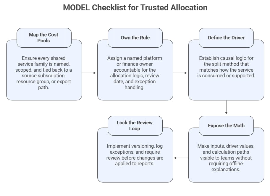 A showback model does not earn trust because it exists. It earns trust because people can trace the logic, test the driver, and see that the rules are owned and reviewed. That is what turns a monthly cost report into a tool teams will actually act on.